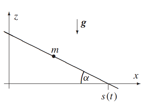 Ein Massenpunkt gleitet reibungsfrei auf einer schiefen Ebene mit konstanter Neigung $\alpha$, die mit $s(t) = \frac{1}{2}at^2$ in $x$-Richtung beschleunigt wird.