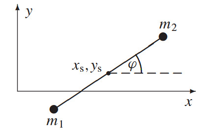Eine Hantel (zwei Massen verbunden durch masselose Stange der Länge $L$) bewegt sich in der $x$-$y$-Ebene unter geschwindigkeitsproportionaler Reibung.